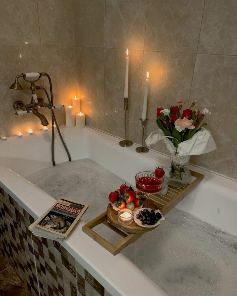 - Prepare a Bubble Bath for Your Partner After a long day, prepare a bubble bath with flower petals, candles, and something to snack and drink. Add a special touch by preparing scrubs and masks to use during the bath, and play soft music or a movie to watch from the bathtub. This gesture will warm your partner’s heart. In a relationship, it’s also important to take good time for oneself.